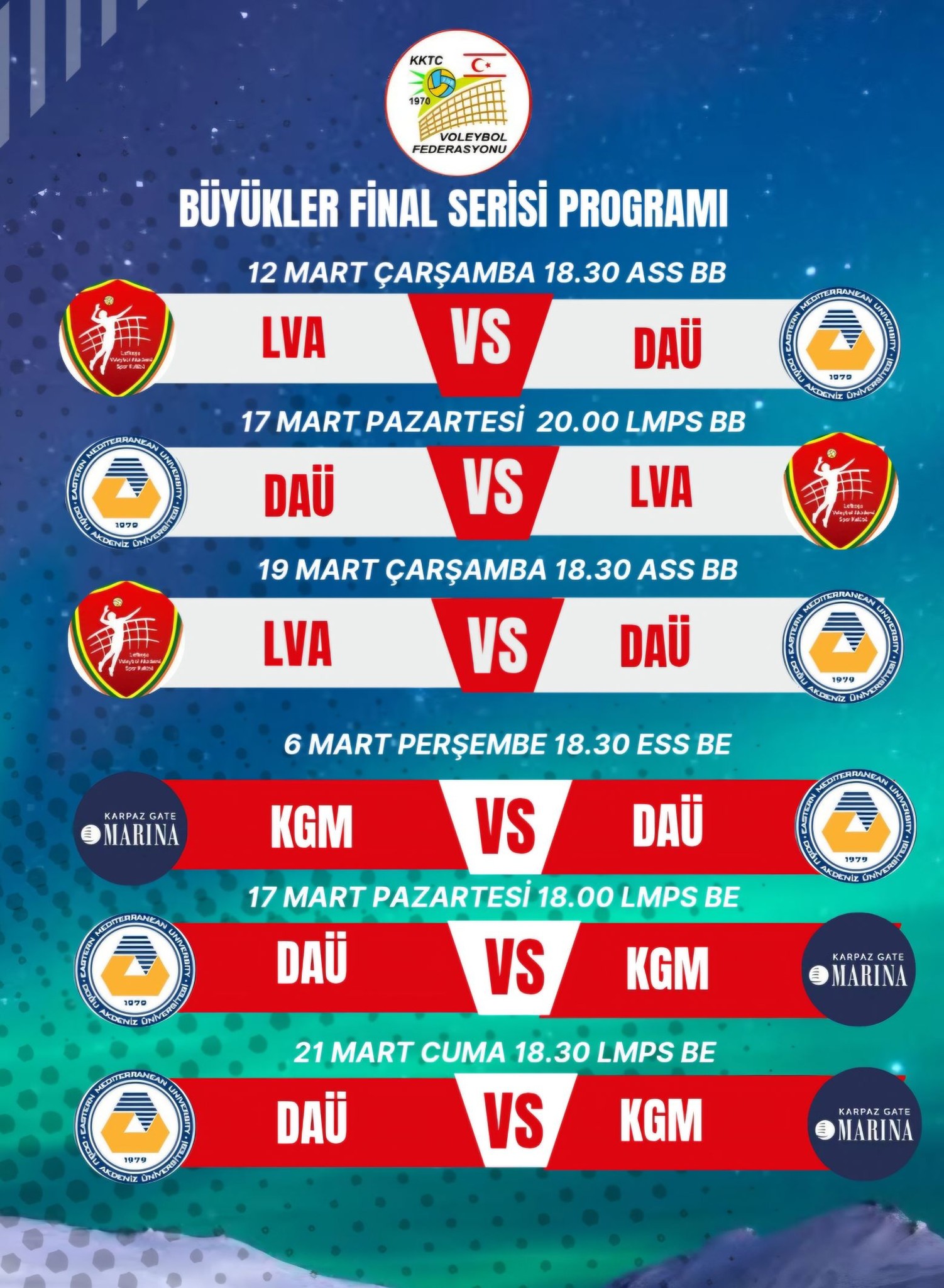 Kadınlarda Final Serisi ilk karşılaşması 12 Mart Çarşamba akşamı Atatürk Spor Salonu’nda Saat 18.30’da LVA ile DAÜ arasında oynanacak. Kadınlar ve Erkeklerde Serinin ikinci karşılaşmaları 17 Mart Pazartesi gecesi Lala Mustafa Paşa Spor Salonu’nda oynanacak ve seride 3’e ulaşan takım 2024-2025 sezonu Lig Şampiyonluğunu elde edecek. Seriye kadınlarda LVA, Erkeklerde de DAÜ 1-0 üstünlükle başlayacak.