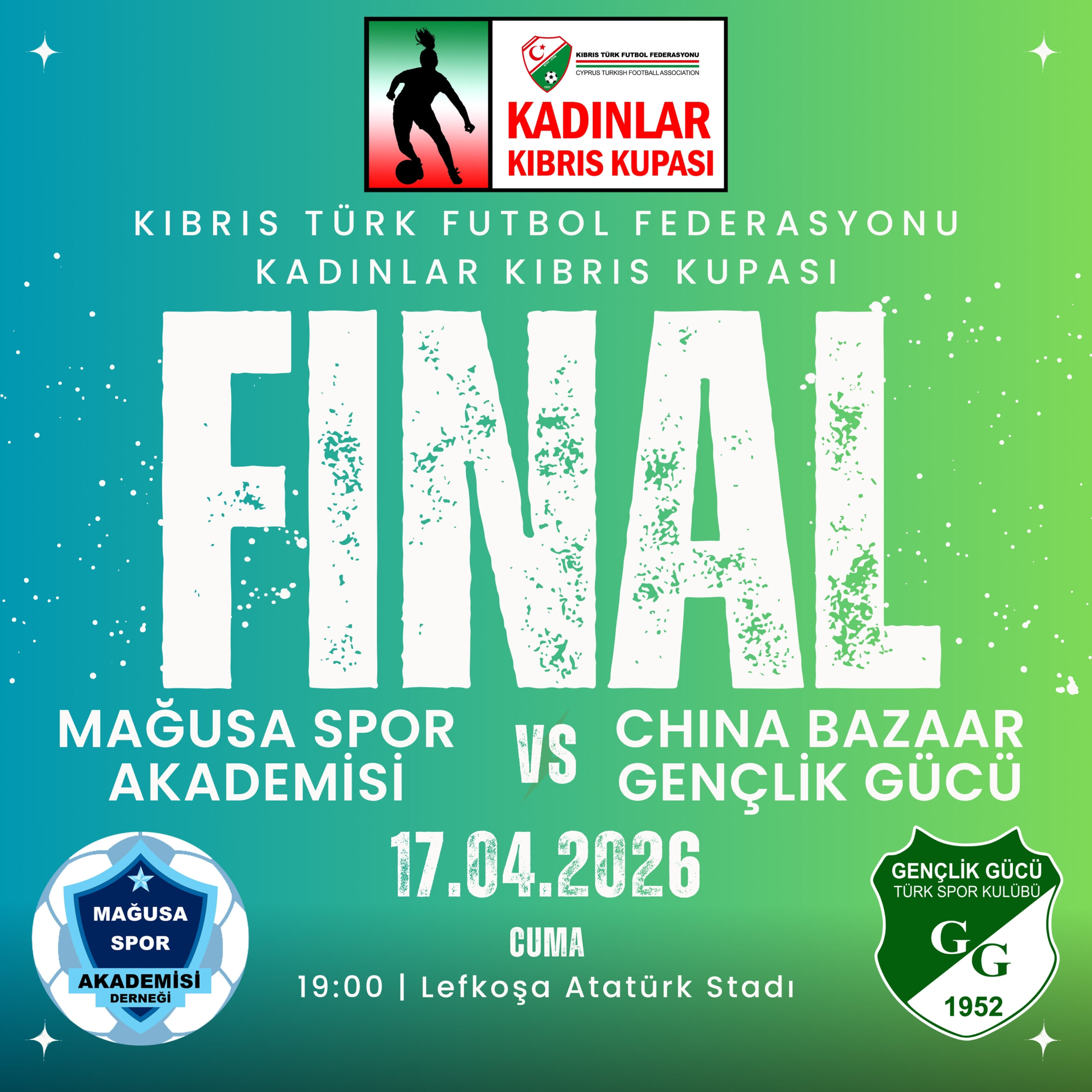 Kıbrıs Türk Futbol Federasyonu (KTFF) tarafından organize edilen Kadınlar Kıbrıs Kupası’nda final heyecanı 17 Nisan 2026 Cuma akşamı Lefkoşa’da yaşanacak. Mağusa Spor Akademisi ile China Bazaar Gençlik Gücü takımları kupa finalinde saat 19.00’da kozlarını paylaşacak. Çeyrek Final’de 1461 İskele Trabzonspor, Yarı Final’de LAÇ Spor Derneği’ni eleyerek finale yükselen Mağusa Spor Akademisi, Çeyrek Final’de Gönyeli, Yarı Final’de de Doğan Türk Birliği’ni eleyerek finale yükselen China Bazaar Gençlik Gücü ile karşılaşacak. Kura çekimindeki şablona göre Mağusa Spor Akademisi final müsabakasında ev sahibi olarak mücadele edecek.