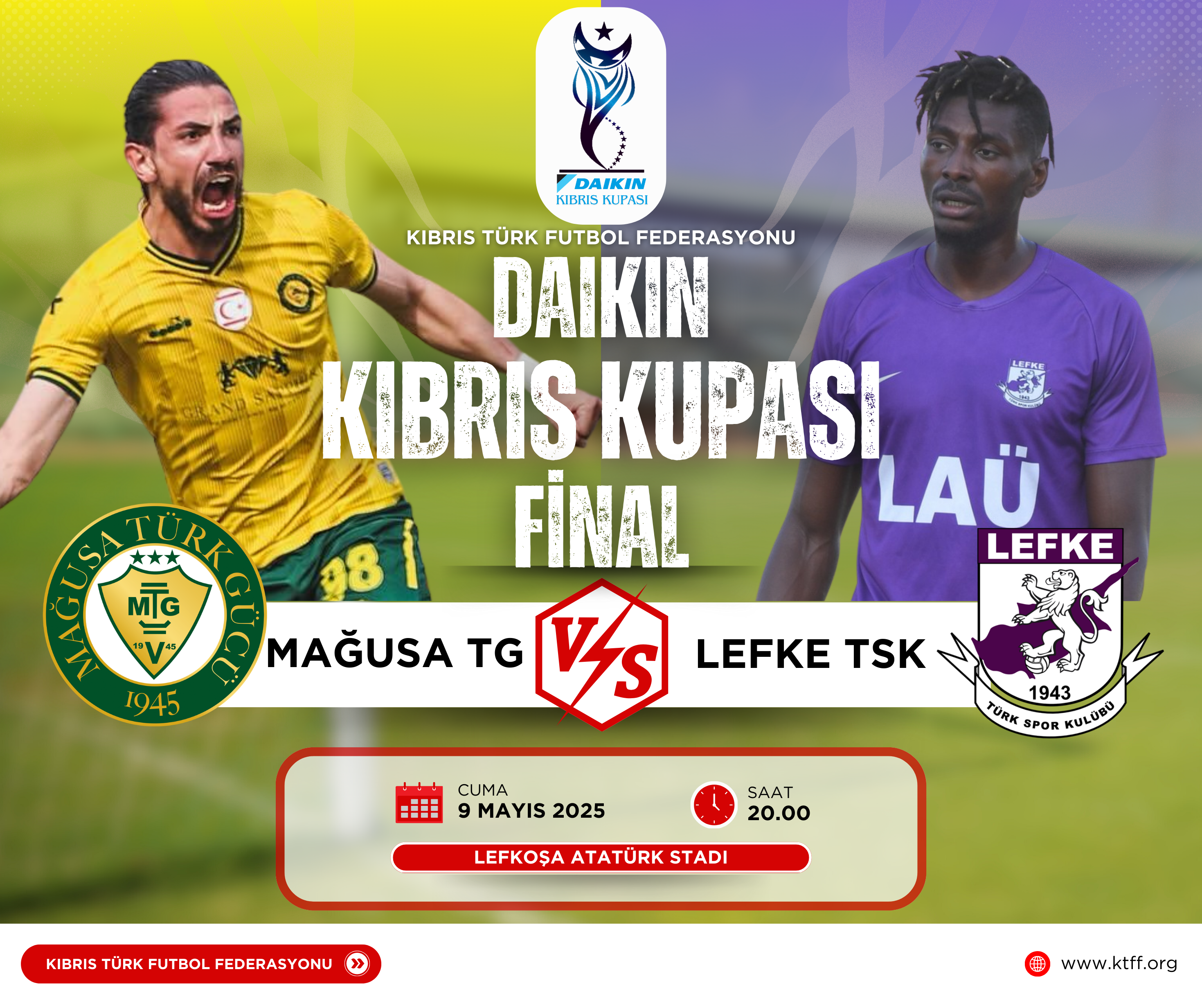 Kıbrıs Türk Futbol Federasyonu (KTFF) tarafından organize edilen Daikin Kıbrıs Kupası’nda final akşamı. Mağusa Türk Gücü ile Lefke TSK arasında oynanacak karşılaşma Lefkoşa Atatürk Stadı’nda saat 20.00’de başlayacak. Karşılaşmada Kerem Eran, Abdulkadir Karadağ, Burak Yiğit ve Şakir Azizoğlu hakem dörtlüsü görev yapacak.