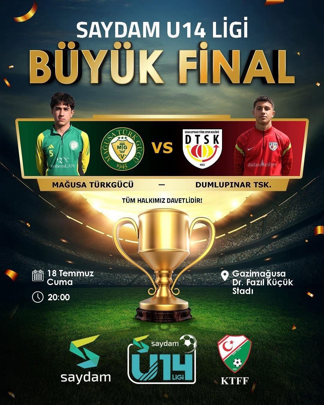Kıbrıs Türk Futbol Federasyonu (KTFF) tarafından organize edilen Saydam U14 Ligi finali bu akşam oynanıyor. Gazimağusa Dr.Fazıl Küçük Stadı’nda saat 20.00’de başlayacak olan karşılaşmada iki Mağusa ekibi Mağusa Türk Gücü ile Dumlupınar karşı karşıya gelecek.