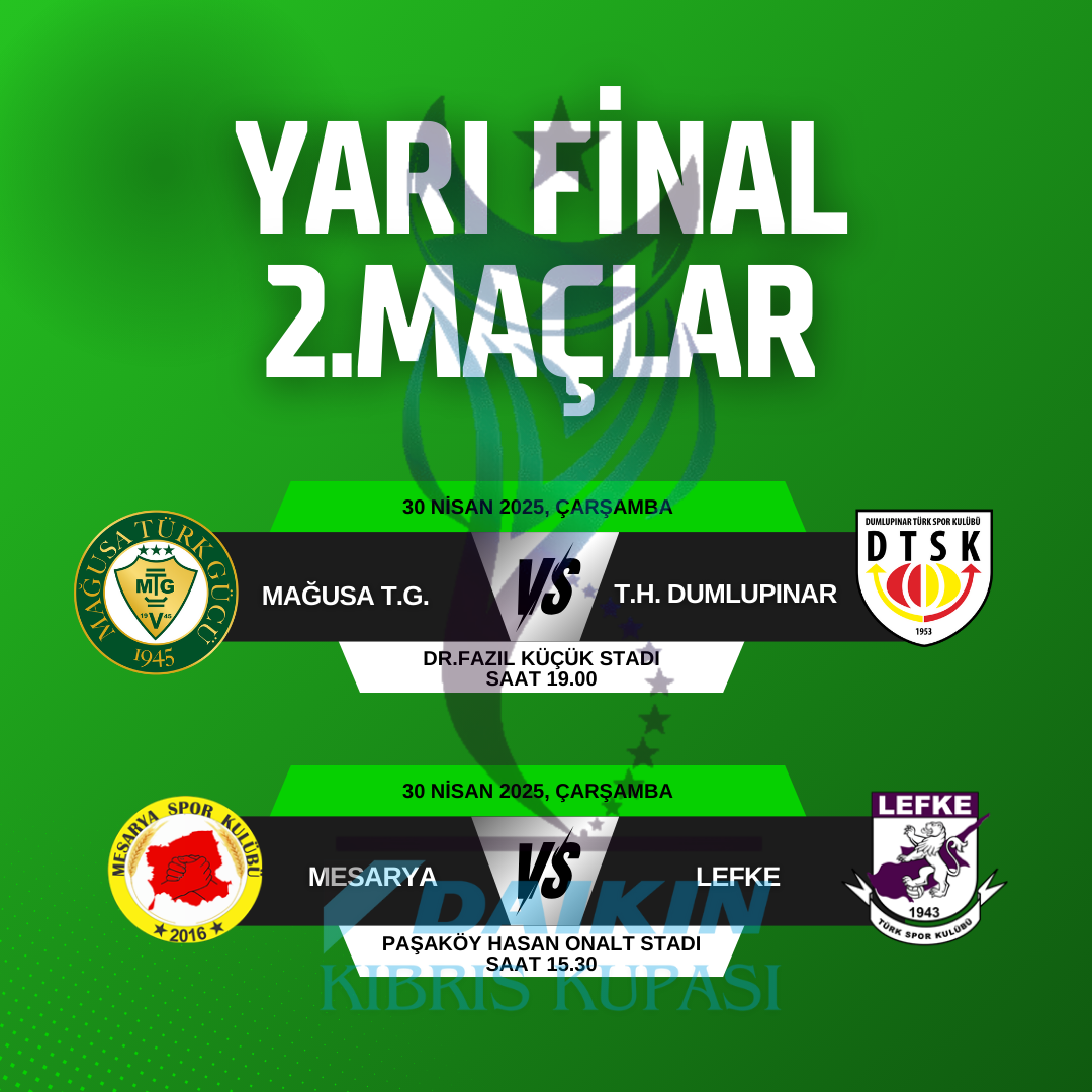 Kıbrıs Türk Futbol Federasyonu (KTFF) tarafından organize edilen Daikin Kıbrıs Kupası’nda yarı final 2.maçlar bugün oynanıyor.